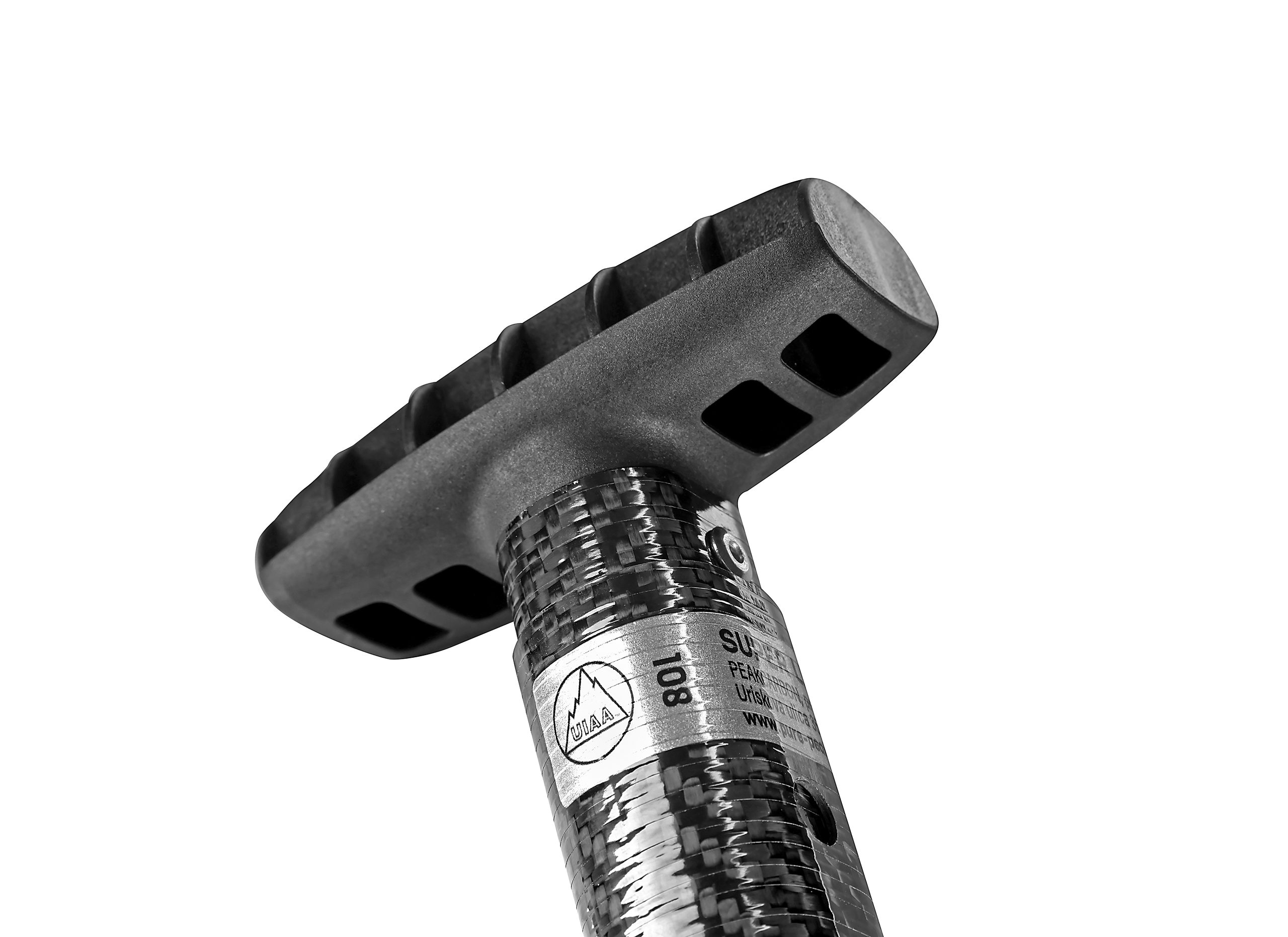 Weighs just 300 g, UIAA certified, and features a carbon blade with a steel-reinforced edge.